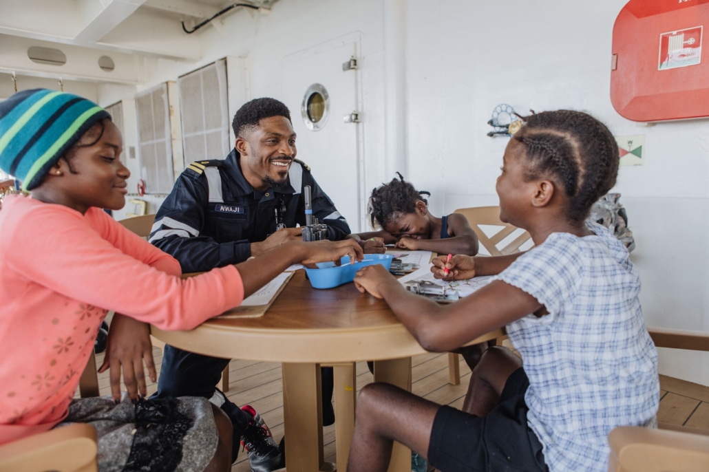 Later that year, Sophia applied to volunteer and join Emmanuel. They committed to serving for two years on board the Global Mercy™. Emmanuel continued as a second officer while Sophia joined as the crew banker.