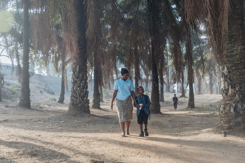 Abubakarr, sur le chemin de l’école avec sa tante.