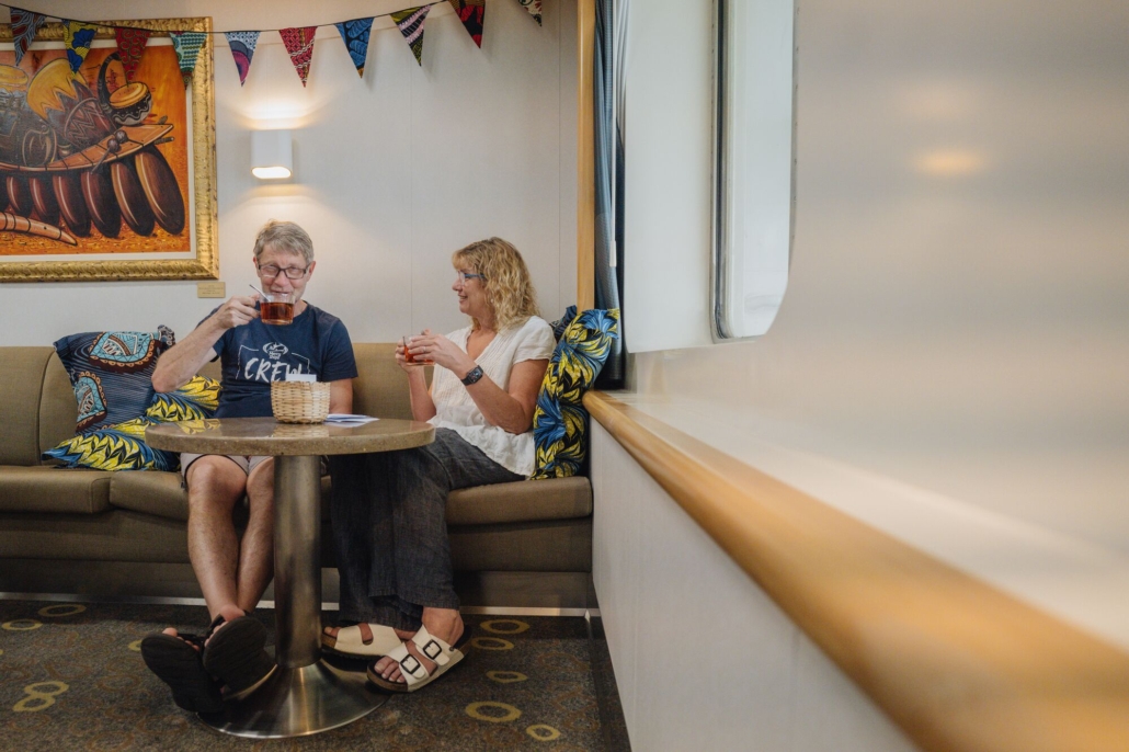 David et Elaine, profitant d’un moment calme dans le café du navire.