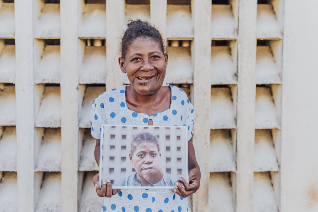 Theogette, maxillofacial patient, holding her after photo.